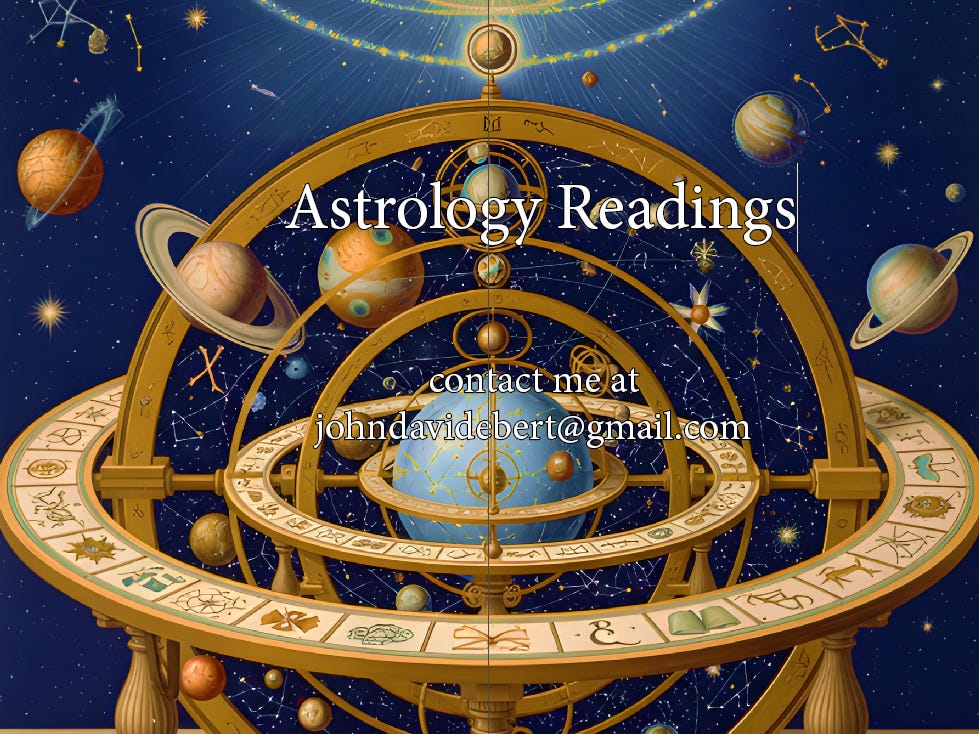 Astrology Readings Discounted!John David EbertAug 21, 2025ShareI’m offering discounted astrology readings, for those interested. They normally cost $150 but I’m offering them for $80 for a one hour session on zoom. Haven’t had a disappointed client yet. If you’re interested hmu at johndavidebert@gmail.com